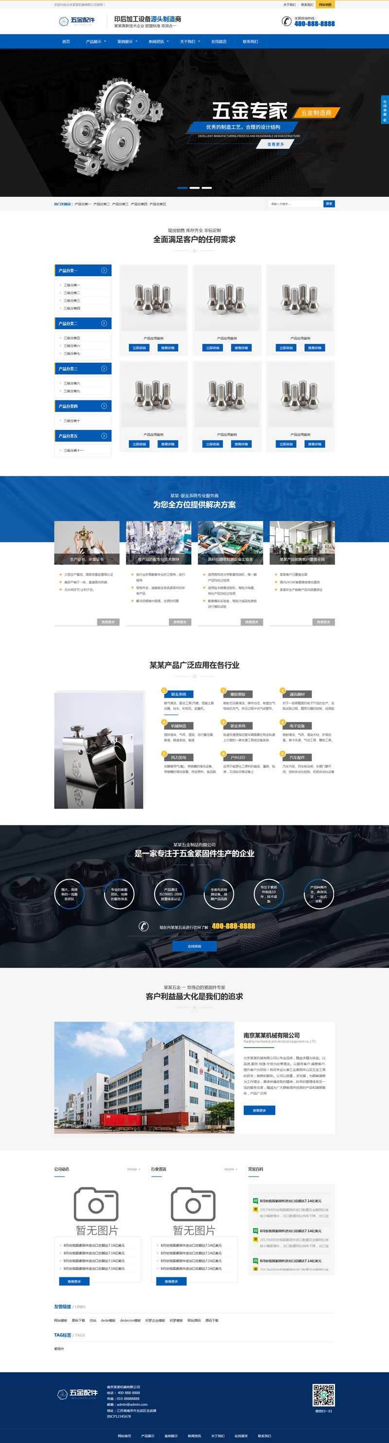 蓝色大气的五金加工设备制造商,五金机械配件公司网站响应式织梦模板dedecms下载。包含:产品展示、案例展示、新闻资讯、关于我们、在线留言、联系我们等模块页面。